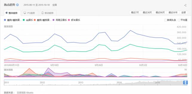 ??? 百度指數方面,筆者直接截取了5款音樂App30天的整體搜索指數與移動搜素指數,可以看到,酷狗音樂在總體搜索指數上(整體+移動)均領先于其它4款產品,而5App的整體排序也基本與此前應用市場的表現一致。