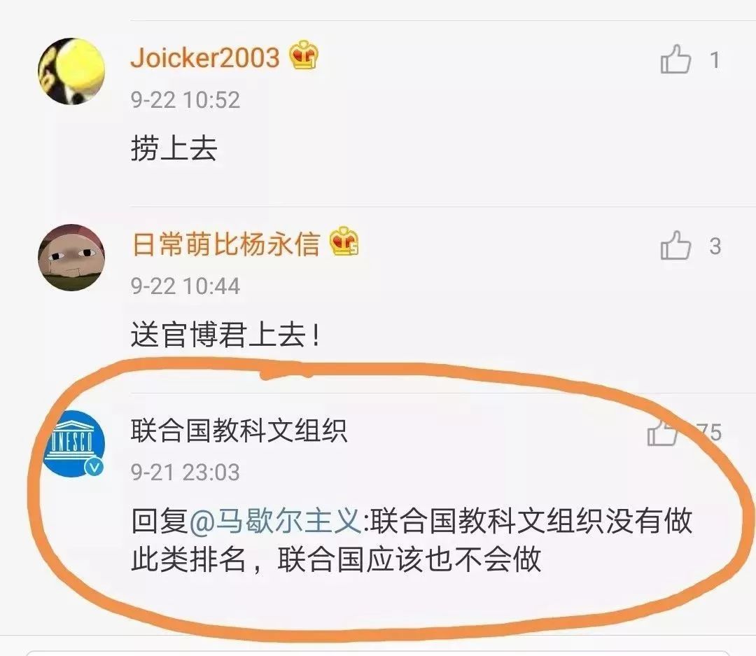 諷刺的是,“杜猛”還在微博最開始加了句“我先聲明一下,可能是聯(lián)合國教科文組織在造假?你忍心一下看完。”結(jié)果聯(lián)合國教科文組織的官方微博當(dāng)天就出來“強(qiáng)力打臉”,聲明“聯(lián)合國教科文組織沒有做此類排名,聯(lián)合國應(yīng)該也不會(huì)做。”這條微博被多名網(wǎng)友舉報(bào),微博管理方最后對(duì)其做了“不實(shí)”的標(biāo)記,對(duì)博主禁言15天,但這條假消息并未被刪,仍然掛在那里,甚是刺眼。而作者在被處理前還接著轉(zhuǎn)發(fā)了好幾條貶低中國的評(píng)論。