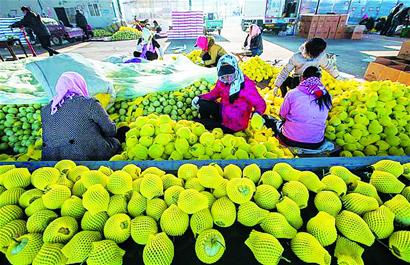 起初,小甜瓜也曾讓瓜農(nóng)們嘗到“苦”味道。隨著甜瓜種植規(guī)模快速擴(kuò)大,交易不便、有市無場成了影響甜瓜外銷的大問題。一個(gè)新的思路在馬連莊鎮(zhèn)決策者的腦海中形成:與其一家一戶到處找商販,不如建設(shè)一處大市場,帶動(dòng)甜瓜業(yè)的良性發(fā)展,通過市場運(yùn)作,安排就業(yè),可以帶動(dòng)第三產(chǎn)業(yè),增加財(cái)政收入。2007年4月,在省道旁、大沽河西岸的寬闊地域,占地300畝的果蔬批發(fā)市場項(xiàng)目上馬,邊建邊試營業(yè)為產(chǎn)供銷搭橋。