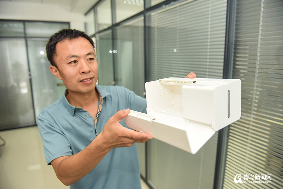 馮全寶的工作室在城陽區(qū)興陽路上的一個(gè)寫字樓內(nèi),百余平米的辦公場地,有將近三分之一的面積都是研發(fā)區(qū)域。初次見他時(shí),他正在辦公室的研發(fā)間對新產(chǎn)品——母嬰護(hù)理柔巾機(jī)做最后的測試。