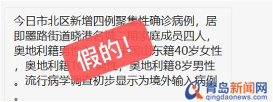 青島新聞網(wǎng)3月31日訊(記者 丁淑華)近日,青島人的朋友圈流傳一則消息稱“市北區(qū)曉港名城二期新增四例奧地利輸入性病例,涉及密切接觸者69名”。經(jīng)落實(shí),相關(guān)信息系不實(shí)信息,曉港名城二期無奧地利入青人員。疫情防控關(guān)鍵是機(jī)器,提醒大家關(guān)注官方疫情發(fā)布,不造謠、不信謠、不傳謠,共同營(yíng)造良好的網(wǎng)絡(luò)環(huán)境。