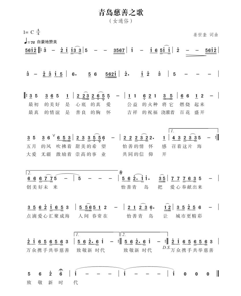 2019年,一首《青島慈善之歌》響徹青島大街小巷,歌曲中洋溢的大愛與慈善精神令人如沐春風。此曲由青島市慈善事業發展服務中心精心打造,集中宣傳展示了青島在慈善事業發展和促進方面的工作與成效,帶有濃厚的“怡善青島”特色。歌詞中,“五月的風”是青島的鮮明印記;“甜美的希望”“善良的胸懷”“怡善青島”“大愛無疆”等是島城公益慈善服務的核心價值;在慈善事業發展的路上,我們只要“點滴愛心匯聚成?!?,就可以“萬眾攜手共舉慈善”。