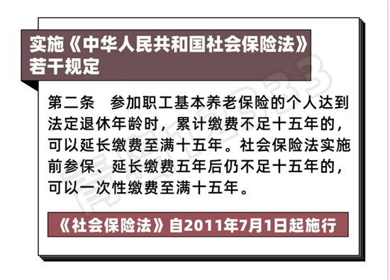 那么,個人達到法定退休年齡時,職工養老保險累計繳費不滿15年,不能辦理退休手續,無法領取養老金怎么辦?市人社局介紹,早在2011年,實施《中華人民共和國社會保險法》若干規定,就解答了這一問題——延長繳費。