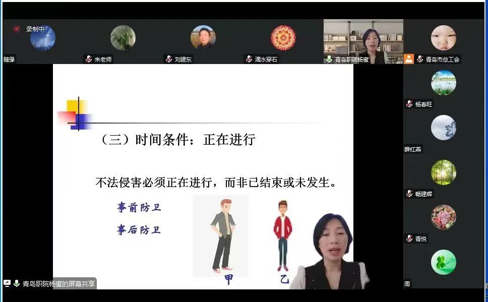 此次講座邀請(qǐng)了青島職業(yè)技術(shù)學(xué)院馬克思主義學(xué)院楊蜜教授作題為《防衛(wèi)“正當(dāng)不正當(dāng)”憑什么說了算?》的“公益大講堂”線上講座。楊蜜結(jié)合實(shí)際案例,從日常生活中出發(fā),詳細(xì)的介紹了什么情況下屬于正當(dāng)防衛(wèi),正當(dāng)防衛(wèi)的前提條件、基礎(chǔ)條件、時(shí)間條件以及限度條件等。講座案例生動(dòng)豐富,講授清晰準(zhǔn)確、自然流暢,不斷得到大家線上的點(diǎn)贊、獻(xiàn)花和掌聲。