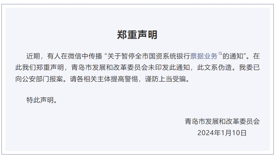 暫停全市國資系統銀行票據業務?青島發改委辟謠:此文系偽造!