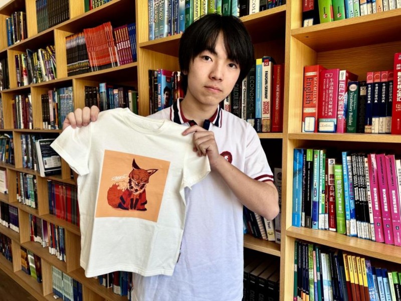 梅爾頓國際學校學生林相儒手持自己原創畫作的T恤衫