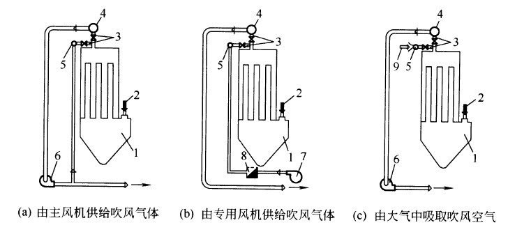 5- 吹風氣體總管; 6- 主風機; 7- 吹風機; 8- 加熱器; 9- 空氣吸入口
