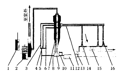 1、程控柜2、專用風機3、內筒進水閥4、外筒進 水閥5、給水閥(電動或手動)6、備用旁路閥7、DSX型濕式除塵器8、排污沖洗閥9、自溢式水箱10、排污閥11、粉煤灰池12、吸塵管路13、輸煤皮帶14、吸塵罩15、雙層導料槽16、風量調節(jié)閥