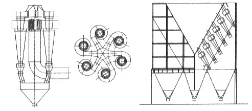 ( 2 )把傳統的單進口改為多進口,有效地改進旋轉流氣流偏心,同時旋風器阻力顯著下降。( 3 )在筒錐體上加排塵通道,防止到達壁面的粉塵二次返混。