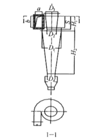 單體基本結構參見圖 1 ,含塵氣體通過進口起旋器產生旋轉氣流,粉塵在離心力作用下脫離氣流和筒錐體邊壁運動,到達壁附近的粉塵在氣流的作用下進入收塵灰斗,去除了粉塵的氣體匯向軸心區域由排氣芯管排出。