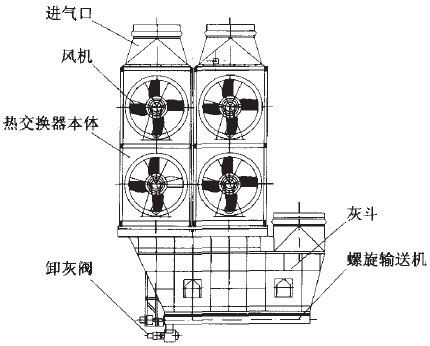 熱交換器由熱交換器本體、風機、進氣口、灰斗、螺旋輸送機和卸灰閥等構成(見圖2)。高溫廢氣(250-450度)首_入熱交換器。熱交換器結構為列管式,排出廢氣和冷卻空氣在其中的熱交換為非接觸式。軸流風機產生的交叉氣流使列管內外的冷熱氣體強制對流,通過冷卻風機的單獨或成組啟動,可以將含塵廢氣冷卻到指定的溫度。