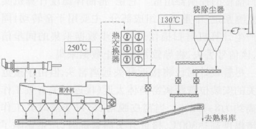 出冷機的高溫廢氣經熱交換器降溫處理后,廢氣溫度由250度降至130度異常時,廢氣溫度可由450度降至180度,再進入布袋除塵器進行收塵處理。同時,熱交換器還可以起到沉降室的作用,預收下部分粉塵。其工藝流程見圖1